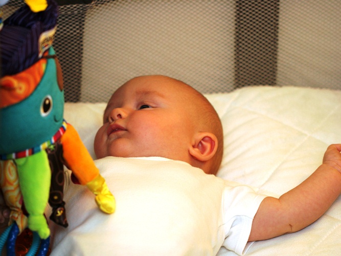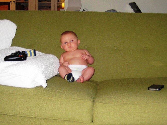 March 2011 It's a beautiful day in the neighborhood, isn't it? We just love these miniature replicas of Dad's feet. All ready for a walk in the sunshine. "Okay Dad, let's try out the new Kinect game you bought." "Lean right." "A little further to the right." "Now a hard left! Oops." Max and Dad picked a flower for Mom. It melted her heart. Max loves Captain Calimari and his fish mobile. Max is watching his fish "swim" while Mom is working.