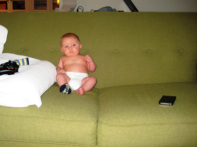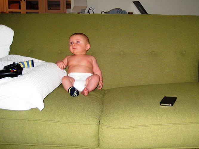 March 2011 It's a beautiful day in the neighborhood, isn't it? We just love these miniature replicas of Dad's feet. All ready for a walk in the sunshine. "Okay Dad, let's try out the new Kinect game you bought." "Lean right." "A little further to the right." "Now a hard left! Oops." Max and Dad picked a flower for Mom. It melted her heart. Max loves Captain Calimari and his fish mobile. Max is watching his fish "swim" while Mom is working.